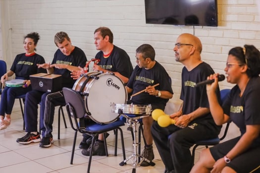 O trabalho com os alunos segue o método do professor Suzuki, que começa com a percussão e depois evolui para os instrumentos melódicos e harmônicos.